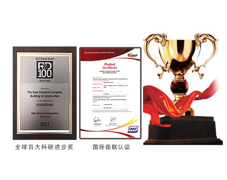 各項國際認證:國際田聯(IAAF)跑道認證,SGS國際認證,RoHS歐盟環境及健康認證,CE歐盟安全認證等